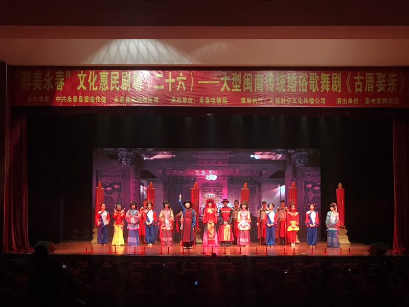闽南最具特色的世界非物质文化遗产精髓大戏、全国唯一一台以闽南民间传统婚俗文化为主题的大型歌舞剧《古厝娶亲》于2019年4月13日在永春人民会堂上演了!